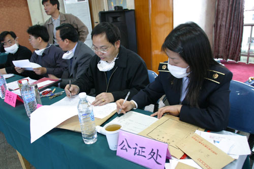 省水利工程建設局陸永泉局長說:面對突發而來的"非典"情況,我們采取了積極的應對之策。一是與來自重點疫情區的投標人協商,勸說其放棄或以特快傳遞方式投標,對放棄投標的單位,退給其購買標書費用并酎情補償;其余單位以郵寄或派人送達標書,所有投標人一律不參加開標會。原定對監理投標單位的總監現場簽辨改為書面答辯。二是為確保投標工作公平、公正、公開,開標過程由紀檢監察部門監督,并請公證機構人員進行公證,招標工作全過程錄象備查,并在江蘇水利網站上公布開標結果。三是接受標書時,對工作場所進行仔細反復消毒,送達標書的投標人需持有權威部門開具的健康證明,到達工作場所時進行體溫檢查,并對裝有投標文件密碼箱進行消毒處理。四是開標前,對工作人員進行體溫測式,發放口罩及手套,對會場和開封的所有投標文件進行消毒。五是制訂并積極落實防治"非典"應急預案。