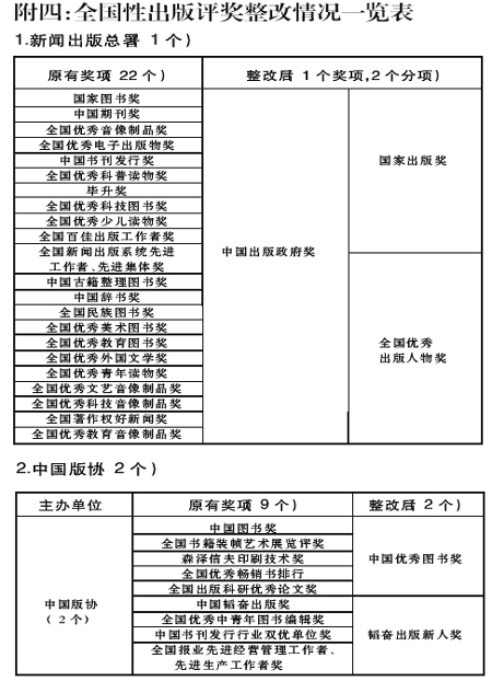 新聞出版總署現有全國性評獎22個。整改后,設立“中國出版政府獎”,由原來的22個減至1個。評選工作兩年一次?!爸袊霭嬲劇毕略O“國家出版獎”和“全國優秀出版人物獎”2個子項。