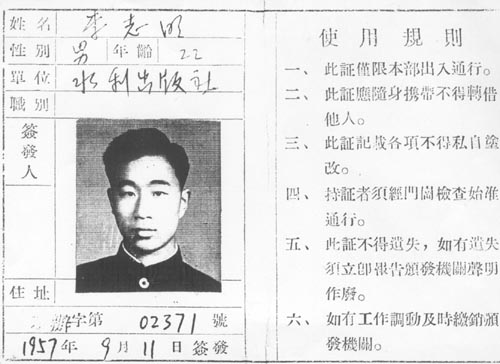 我還保存著在出版社工作期間水利部機關大院的出入證、醫療證及在二里溝出版社址的一張個人照,一并附上。