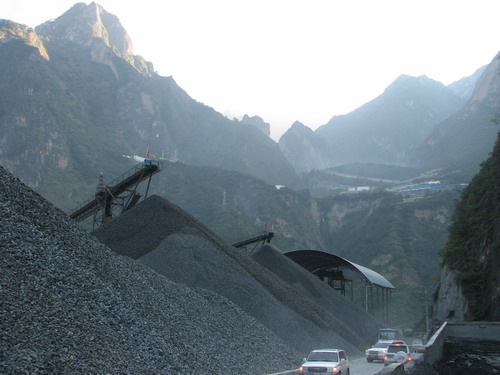 開采出的骨料(石頭子)要運輸到篩選廠。這是皮帶運輸機