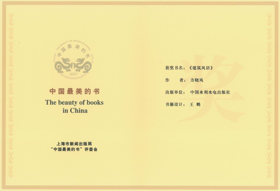 2010年11月22日上午9點, 2007—2009年度“中國最美的書”頒獎大會在上海新聞出版大樓召開。我社副社長胡昌支出席頒獎大會。由我社美編王鵬設計的圖書《建筑風雨》、《當代建筑設計理論》喜獲2007、2009年度 “中國最美的書”稱號,王鵬獲頒出版單位獎狀證書及設計者獎狀證書。
