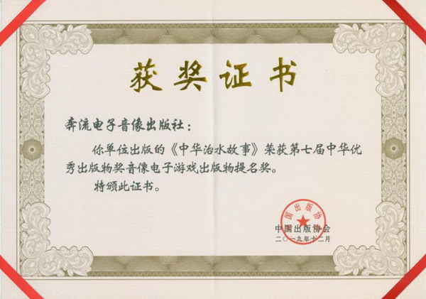 近日,中國出版工作者協會頒發了第七屆中華優秀出版物獎的獲獎證書,我社出品的“中華治水故事”動畫片獲得音像電子游戲出版物提名獎。