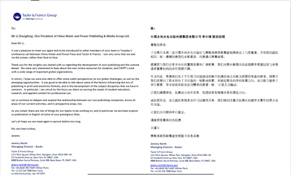 會后,泰勒·弗朗西斯集團全球圖書業務總裁Jeremy North先生代表集團發來致謝信,對雙方日后的深入合作表達了熱切的期盼。