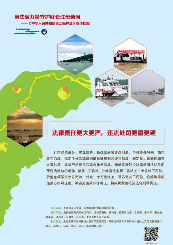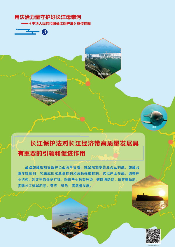 《長(zhǎng)江保護(hù)法》將習(xí)近平總書記關(guān)于長(zhǎng)江保護(hù)的重要指示要求和黨中央重大決策部署轉(zhuǎn)化為國(guó)家意志和社會(huì)行為準(zhǔn)則;把保護(hù)和修復(fù)生態(tài)環(huán)境擺在壓倒性位置,為長(zhǎng)江母親河永葆生機(jī)活力、中華民族永續(xù)發(fā)展提供了法治保障;對(duì)長(zhǎng)江經(jīng)濟(jì)帶高質(zhì)量發(fā)展具有重要的引領(lǐng)和促進(jìn)作用?!堕L(zhǎng)江保護(hù)法》是中國(guó)特色社會(huì)主義法制建設(shè)的重大實(shí)踐,也是長(zhǎng)江流域保護(hù)和治理發(fā)展史上的一座里程碑。掛圖介紹了《長(zhǎng)江保護(hù)法》實(shí)施的重要意義、基本內(nèi)容、適用范圍以及在法律和制度層面的創(chuàng)新等,重點(diǎn)闡釋了涉水條目相關(guān)內(nèi)容。(標(biāo)準(zhǔn)化出版分社供稿)