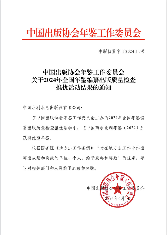 近日, 中國出版協會年鑒工作委員會發布了《2024 年全國年鑒編纂出版質量檢查推優活動結果公布的通知》(中版協鑒字〔2024〕7號文)。由我社編輯出版的《中國水利年鑒2023》被評為“特優年鑒”,《中國南水北調年鑒2022》《中國河湖年鑒2022》獲評“優秀年鑒”。